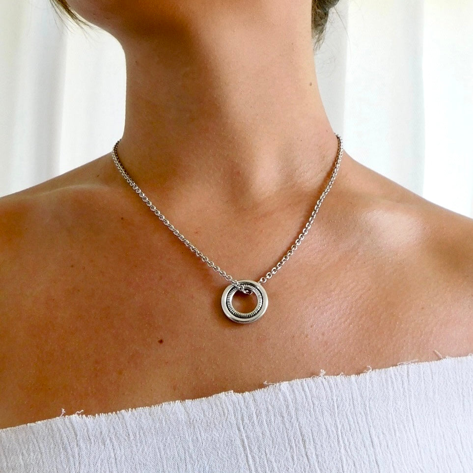Each item is handmade and textured by Samantha Lombardo and is meant to serve as a representation of the links that are personal to each client. She is creating the jewelry, but you are ascribing the meaning to your piece. No two items are the same, much like the stories that are unique to each of us.